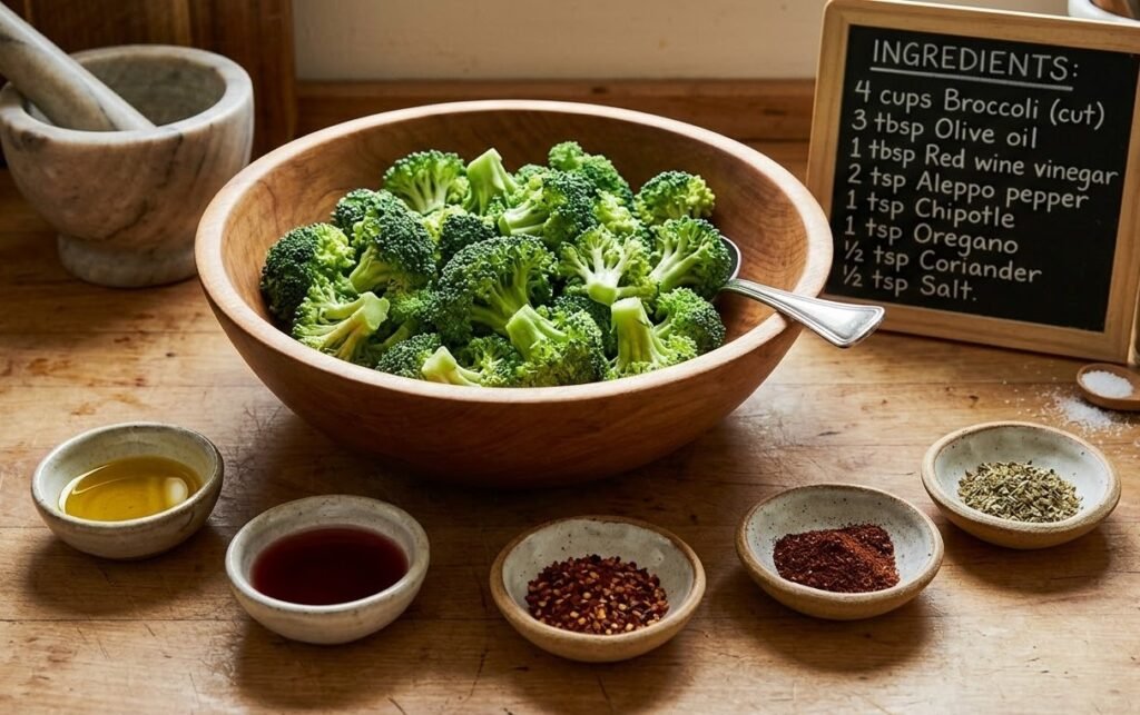 The dish combines fresh broccoli florets with warm spices, olive oil, and acidity.